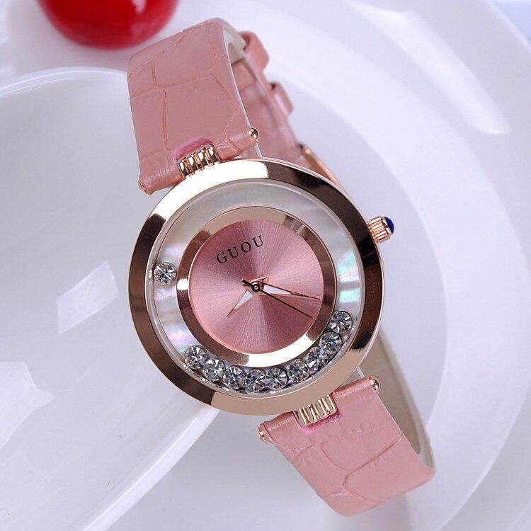 แฟชั่นGUOU 8039ยี่ห้อผู้หญิงกลิ้งเจาะชุดนาฬิกาหรูหราดูดสบายๆนาฬิกาหนังแท้R Hinestoneเลดี้นาฬิกาข้อมือ ราคาส่ง