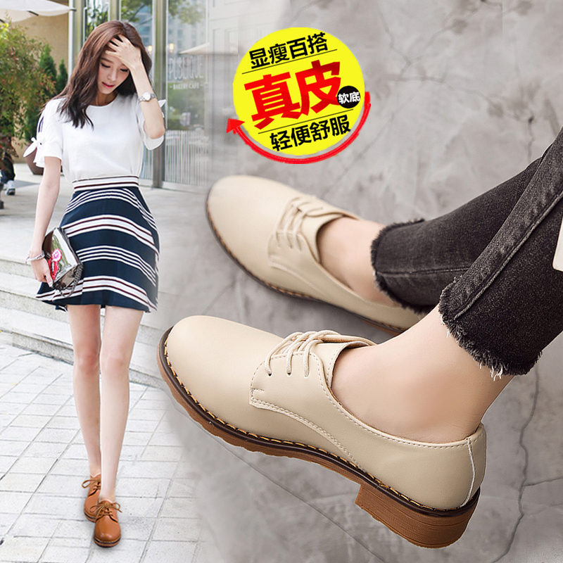 2020 ใหม่คอลเลคชั่นฤดูใบไม่ผลิสไตล์อังกฤษรองเท้าสตรีลำลองรองเท้าหนังแท้ส้นหนาเข้าได้หลายชุดแบนหัวกลมผูกเชือกรองเท้าหนังขนาดเล็ก